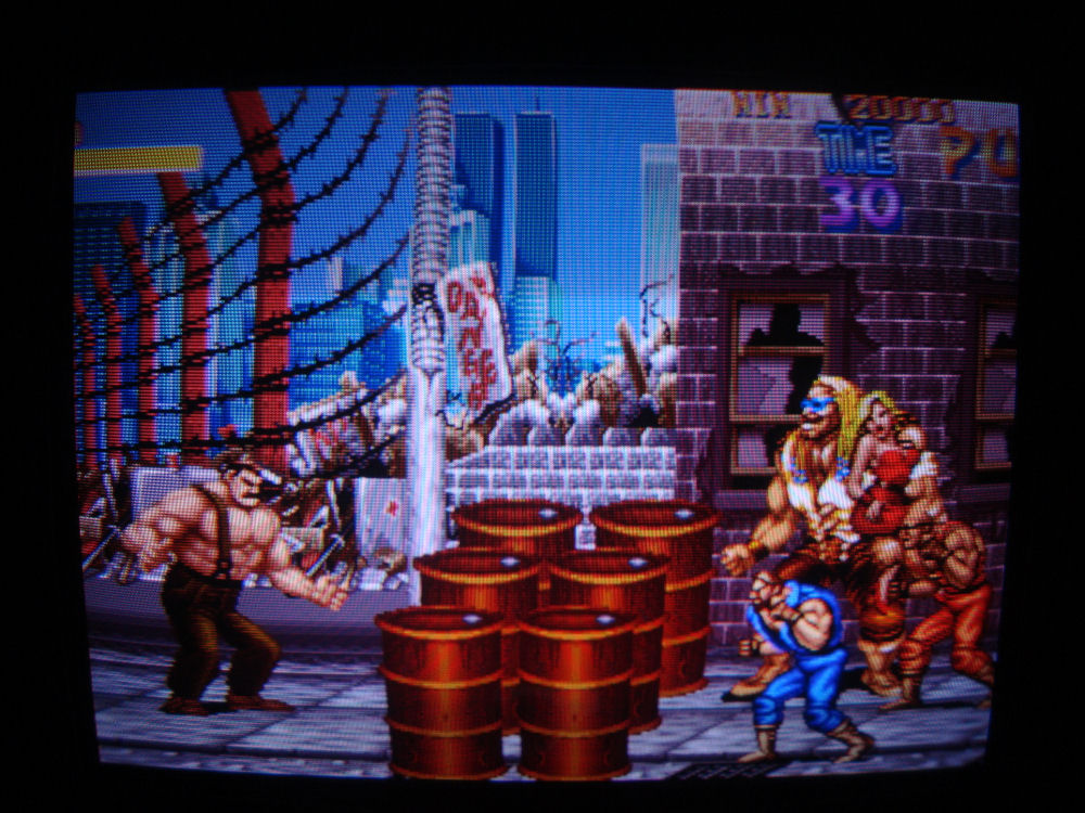 The monitor is an original CRT that has been rebuilt and looks great! The joysticks work great for the fighting games, and everything works as it should.