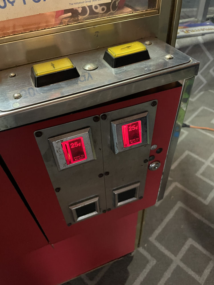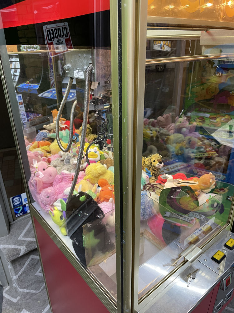 This machine was built in the last 15 years or so. The game is in used condition and is clean. It works really simple, insert a quarter, push the button to move it back, and then push the button to move it right and the claw drops.