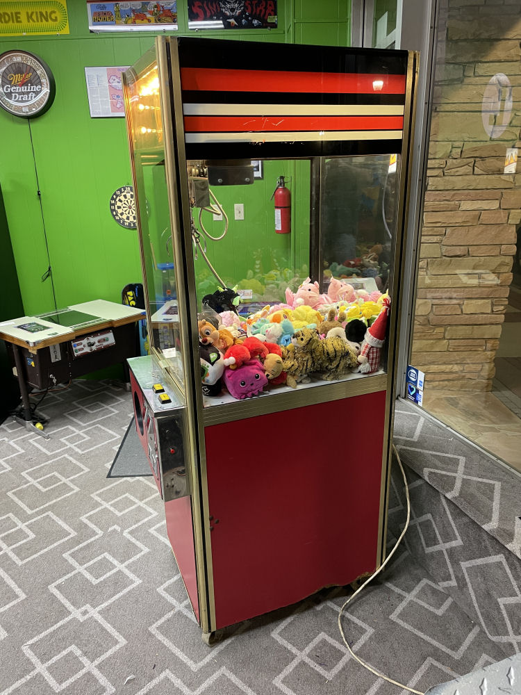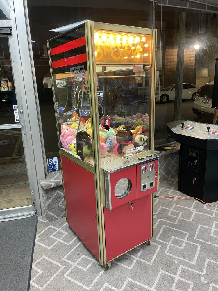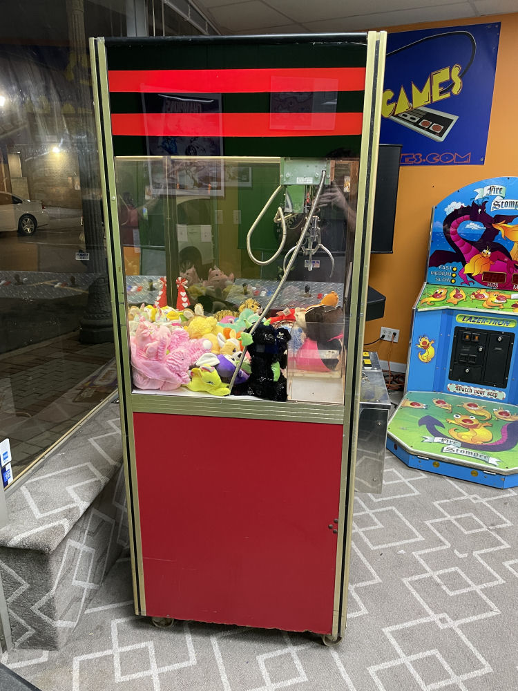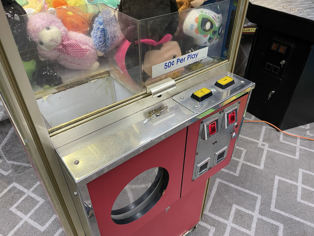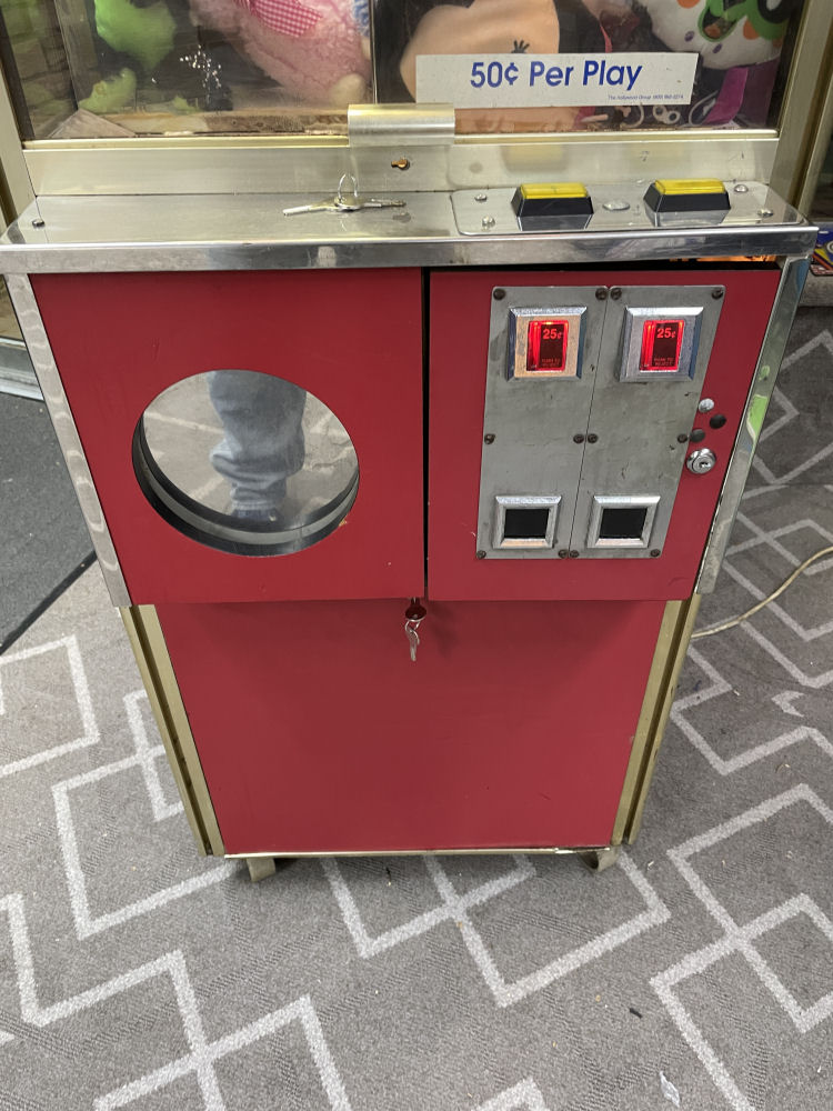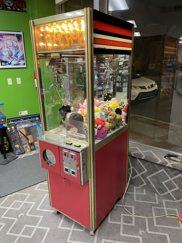 This machine was built in the last 15 years or so. The game is in used condition and is clean. It works really simple, insert a quarter, push the button to move it back, and then push the button to move it right and the claw drops.